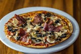 Crispy round pie topped with fresh chicken and mushrooms in a brown Marsala wine sauce, with fresh mozzarella.